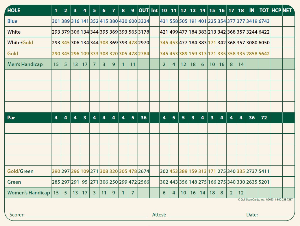 Condition/ratings today: Woodland plays as a par 72 at 6,743 yards (Blue); the club publishes rating/slope of 72.8/134 from the back set—figures consistent with the modernized hazards and expanded targets.