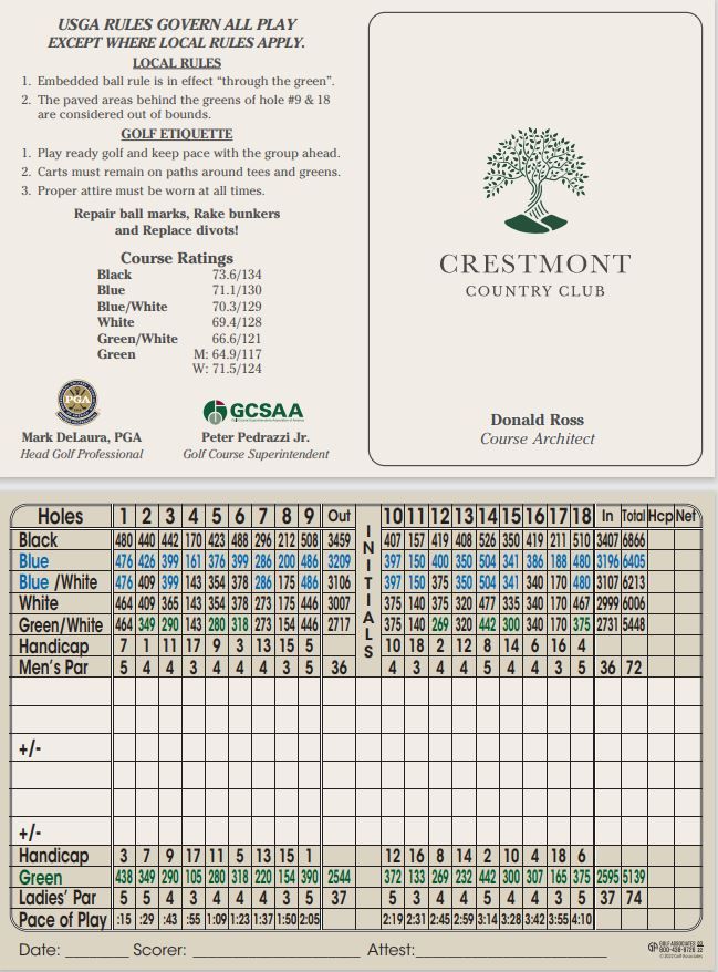 Set on high ground above the suburban ridge of West Orange, New Jersey, Crestmont Country Club is a private 18-hole course whose current presentation blends a substantial body of Donald Ross work with later alterations and modern restoration. The property occupies rolling, tree-lined terrain with long views to the south and east; water hazards and a network of ravines punctuate the routing. From the back tees the course plays approximately 6,866 yards, par 72, with five sets of tees to scale difficulty. The club operates a full practice range and short-game areas, and a multi-phase clubhouse and pool renovation completed in recent years added expanded dining and patio spaces while modernizing locker and service facilities. For competitive golfers, Crestmont has hosted sectional qualifiers (including USGA senior events) and a busy in-house tournament calendar; a walking-friendly topography and an active caddie culture complement the experience. Day-to-day conditioning emphasizes firm fairway surfaces and quick, subtly contoured bent-grass greens. The club is strictly private; outside access is generally limited to organized events.