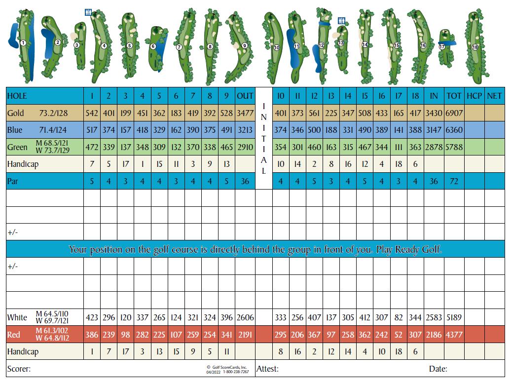 Facilities and presentation. The course operates as a public daily-fee venue with an active practice range and community programming. The official scorecard confirms par 72 and the 6,907-yard back-tee yardage, with five tee sets that broaden accessibility—figures that also align with the Florida Historic Golf Trail’s “Today” summary.