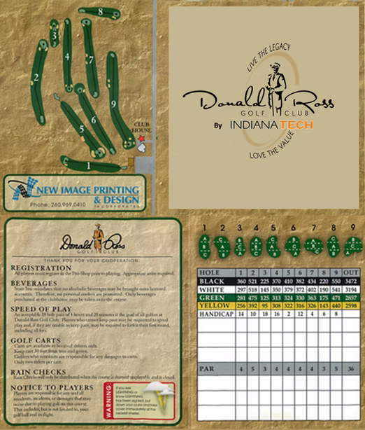 Routing and hole sequence. The routing now in play corresponds to the front nine historically attributed to Ross. The hole-by-hole distances and par sequence (par-36 total; par-5s at #2 and #9; long one-shotters at #3 and #8) align with the “original nine is back” messaging on the club site. Indiana Tech’s decision to remove the back nine means any 1970s expansion corridors are no longer extant on the ground.