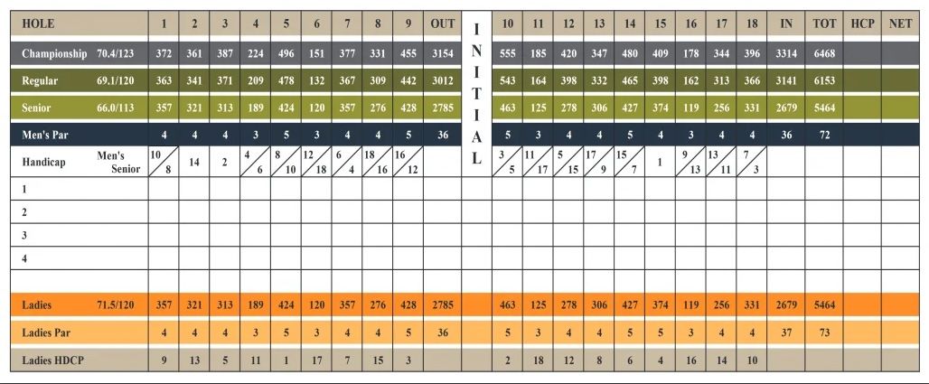 Routing & corridors. Club communications insist the layout has not changed, and the contemporary scorecard shows a traditional 36-36 split consistent with a 1920s plan. While greens and bunkers have evolved with maintenance eras, the hole sequence and yardage balance (e.g., three par-5s on the inward nine, two long par-3s on the outward) indicate continuity of routing. Verification against historic aerials/drawings would be required for a definitive corridor-by-corridor survival map.