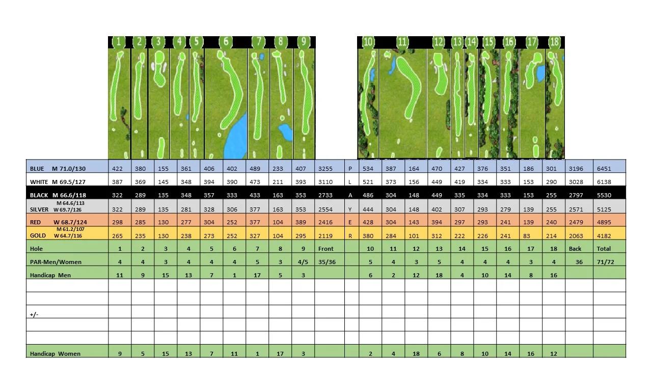 Kinderton Country Club, “Hole by Hole” scorecard PDF (yardages by tee and narrative notes for each hole): https://kindertoncountryclub.com/wp-content/uploads/2023/08/Hole-by-Hole.pdf.