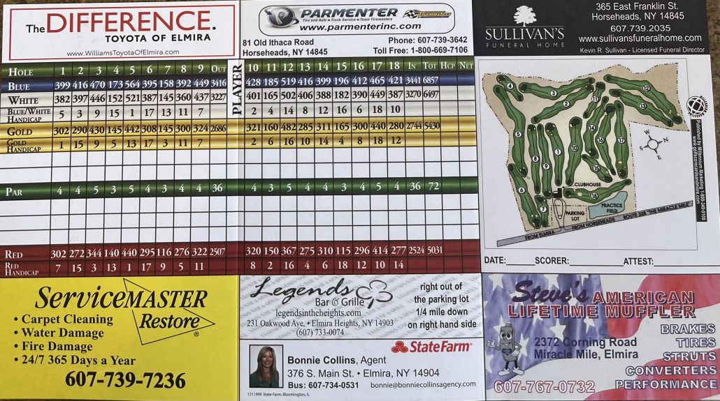 Mark Twain Golf Course sits on the south-facing hillside above the Chemung River valley in the Town of Horseheads, operated by the City of Elmira. Today it functions as a busy, affordable municipal course with a full pro shop, snack bar, and practice amenities that include a driving range and short-game areas. The card plays to 6,857 yards (blue tees) at par 72, with a contemporary USGA course rating of 73.6 and slope of 130 from the tips. Visitors encounter a walkable but decidedly rolling layout: multiple uphill tee shots and approaches, and a sequence of downhill holes that spill along an escarpment. Public tee times, league play, and scholastic events dominate the calendar, and the facility regularly hosts statewide high-school championships, which underscores its continued tournament utility. Course information (yardage, rating/slope) is published by the club; amenities are corroborated by national tee-time providers. In recent years the City has invested in infrastructure—most notably a full irrigation replacement approved in 2024—while planning near-term bunker work, changes that will influence daily presentation without altering the basic character locals recognize.