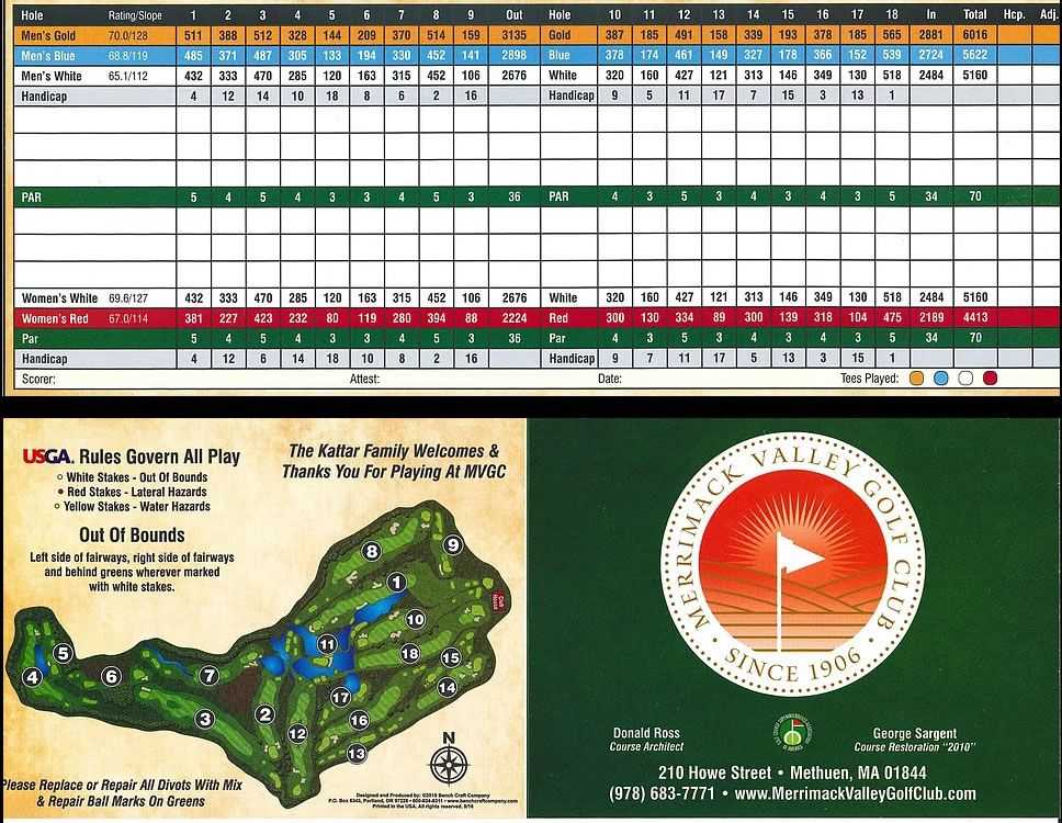 Merrimack Valley Golf Club, official website (home, history, and rates/scorecard pages), accessed Sept. 2025. The site attributes the original course to Donald Ross (1906) and describes a 2008 “reconstruction” by George F. Sargent Jr.; the rates page contains the current scorecard image and operating details.
