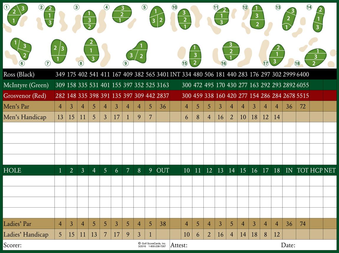 Documented alterations include later-era architectural input from Jerry Matthews and Bruce Matthews III, though dates and scope are not provided online by either the Matthews portfolio pages or course directories. The presence of three named tee sets (Ross / McIntyre / Grosvenor) and contemporary scorecard yardages suggests the course has been re-rated and, likely, selectively re-teed for modern play, but there is no public record that green pads were rebuilt wholesale or that bunkering was comprehensively recut to a different aesthetic. The large pond influencing the 9th remains an attribution question: it is visually prominent today, but its origin (original vs. later) is not documented in accessible sources.