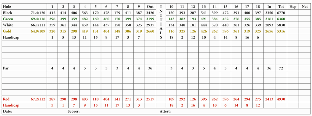 Routing and scale. The 18-hole routing and par-72 scale remain consistent with mid-century cards, with tips around 6,6xx–6,7xx yards. The course still presents open corridors bordered by groves and scrub pines, and a traditional clubhouse-centric loop.