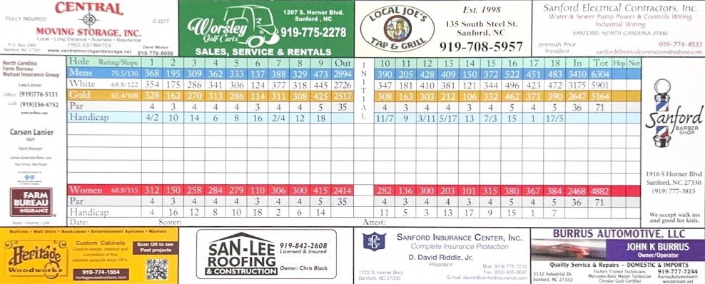 Because Sanford began as a Ross nine and later grew to 18, the course today blends Depression-era corridors with later additions. The front-side profile—short-to-mid par-4s punctuated by compact one-shotters—reflects the modest land and budget of a 1930s municipal nine (e.g., front-nine par is 35 with six par-4s and one par-5 with a total distance of 2,894 yards). While greens were rebuilt in 2002, the scorecard’s yardage pattern still shows the emphasis on approach precision rather than brute length, a hallmark of many small Ross munis from the period.