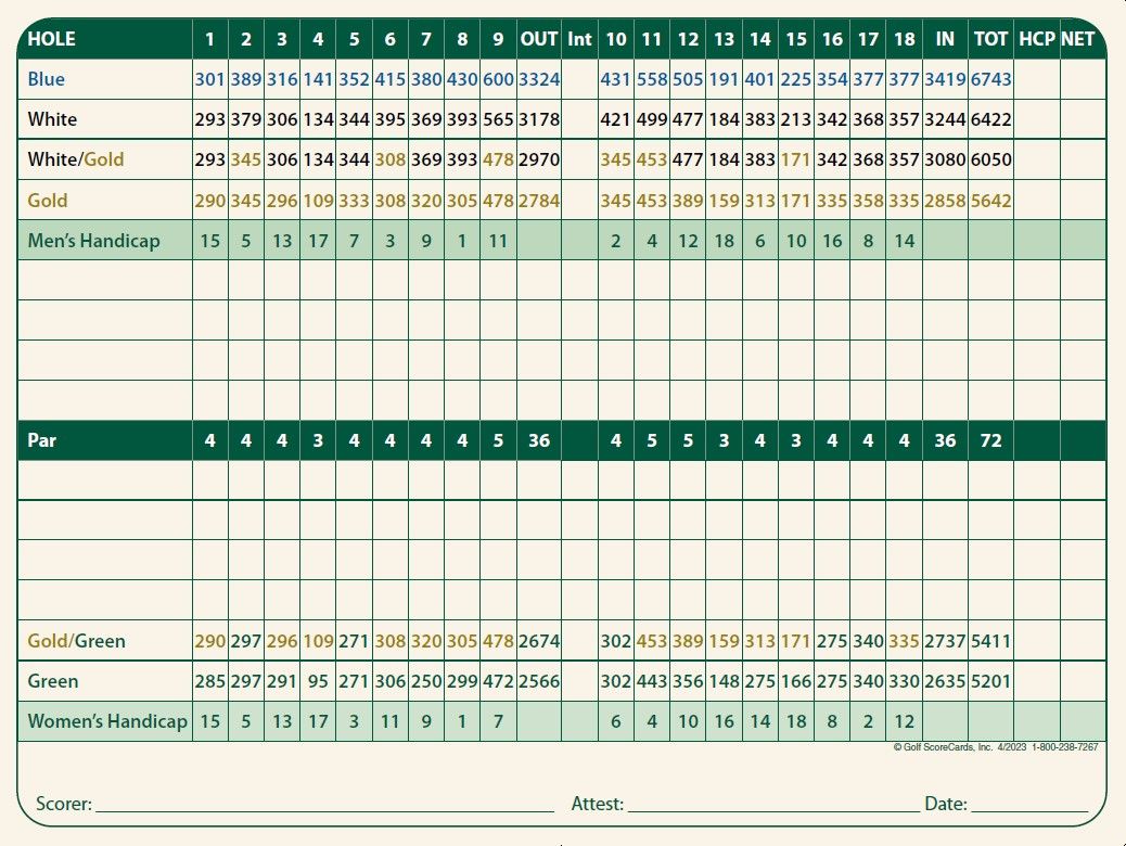 Condition/ratings today: Woodland plays as a par 72 at 6,743 yards (Blue); the club publishes rating/slope of 72.8/134 from the back set—figures consistent with the modernized hazards and expanded targets.