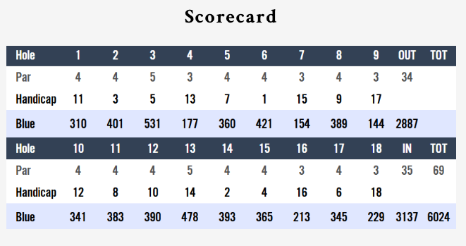 Routing and greens. The current scorecard sets the course at par 69 / 6,024 yards, with rating/slope of roughly 70.5/128 from the back tees. Those numbers, and the present hole-by-hole, reflect the post-highway alignment rather than a preserved pre-war Ross routing. A claim sometimes repeated in tertiary sources—that “some original Ross holes remain,” with the 16th singled out—may be correct, but no club-published list of surviving Ross greens or corridors is available online.
